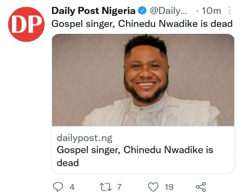 Chinedu Nwadike Dead / Is chinedu nwadike dead attributable to kidney failure?. Idoma voice reports that the renowned music evangelist died on sunday at the age of 39. Popular nigerian gospel singer and evangelist, chinedu nwadike is dead. Is chinedu nwadike dead attributable to kidney failure? He reportedly died on sunday, march 27, 2022 at an hospital in abuja. Chinedu passed away after a long battle with blood cancer.